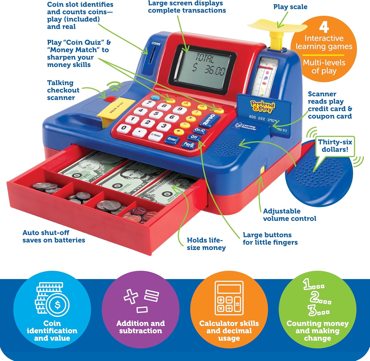 Whether they're scanning items, calculating change, or swiping a card, your child will gain self-confidence in early math and cash management skills-- all while having a blast.